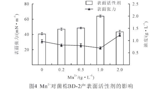 由圖5可知,當Fe2+濃度為0.2 g/L時,表面張力最大,可達66.4 mN/m,而表面活性劑量為1.22 g/L,當Fe2+濃度是CK時,表面張力最小,為30.9 mN/m,此時的表面活性劑量為1.27 g/L,而當Fe2+濃度為2 g/L時,表面活性劑量最大,為1.37 g/L,此時的表面張力為56.6 mN/m。分析可得,增加Fe2+后,菌株的表面張力明顯增加,表面活性劑量無顯著變化(P>0.05),Fe2+對菌株BD-2產表面活性劑無促進作用。