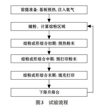 的當(dāng)量直徑,μm;ni為當(dāng)量直徑為di的顆粒的個(gè)數(shù)。計(jì)算可知,試驗(yàn)粉末的算術(shù)平均直徑為65μm。再取100 mL的試驗(yàn)粉料稱重,凈重為0.40 kg;計(jì)算得到試驗(yàn)粉末體積孔隙率ε為0.49,因此粉末顆粒并非最緊密堆積狀態(tài)。熔粉制備了橫截面積為5 cm2,長5 cm的圓棒,每層鋪粉0.10 mm,實(shí)驗(yàn)流程如圖3所示。