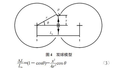 電子束熔粉與激光熔粉不同,因?yàn)殡娮邮且詭щ娏W拥亩ㄏ蜻\(yùn)動(dòng)產(chǎn)生的動(dòng)能作為能量來源的,所以必須有導(dǎo)電回路才能不斷地轟擊工件。但粉末層是孔隙材料,導(dǎo)電性較差,因此在電子束接觸粉末的瞬間可能出現(xiàn)靜電潰散現(xiàn)象。為了確定熔粉初期的工藝模式,文章選用了雙球模型,計(jì)算不發(fā)生靜電潰散時(shí)的臨界線收縮量,結(jié)構(gòu)模型如圖4所示。計(jì)算公式如式(3)。