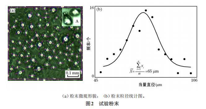 本文以不銹鋼316L(022Cr17Ni12Mo2)球粉為成形原料,顆粒直徑為45~106μm(如圖2所示)【316L不銹鋼的微觀組織:相鄰熔覆道之間的搭接良好。組織主要由胞狀晶和呈外延生長的柱狀晶組成,柱狀晶的取向各不相同。由于熔池邊界處粉末未熔化區(qū)域溫度較低,因此一部分晶粒沿著熔池邊界外延生長,同時(shí)在SLM過程中,熔池內(nèi)部經(jīng)歷快速冷卻,表面張力形成梯度,熔池內(nèi)部存在“馬戈紊流”,熔池內(nèi)發(fā)生對(duì)流,導(dǎo)致熔池內(nèi)部散熱方向發(fā)生改變,因此,造成晶粒顯示出不同的生長方向。胞狀晶呈正六邊形,為柱狀晶的截面,柱狀晶晶粒十分細(xì)小,直徑分布在0.4~0.7μm。】,根據(jù)筆者已有的研究結(jié)果選擇合適的工藝,詮釋顆粒群的熔合線收縮和再結(jié)晶過程。由于試驗(yàn)粉末顆粒直徑分布廣,為了建立粉末計(jì)算模型,用式(1)、(2)計(jì)算了顆粒群的當(dāng)量直徑d和算術(shù)平均直徑d。