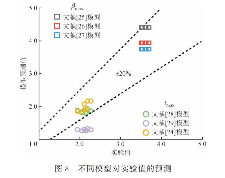 式中:tmax,pre和βmax,pre為使用各模型的最大鋪展時間和最大鋪展因子預測值;tmax,exp和βmax,exp為最大鋪展時間和最大鋪展因子實驗值。如圖8所示,不同公式的預測結果不同,對于最大鋪展因子,盡管不同學者提出的表達式對實驗結果的預測準確率均較好,單個數據點的偏差均在20%以內,然而由于表達式的限制,無法針對液滴沖擊不同水平壁面過冷度的實驗工況進行預測,存在一定缺陷。對于最大鋪展時間,Huang和Chen等人提出的表達式預測效果較差,Wildeman等提出的表達式預測效果較好,相對平均偏差為12.32%,但由于其表達式內不包含水平壁面過冷度的影響因素,因而預測效果略差于Shang等提出的表達式,其相對平均偏差為6.05%。綜上所述,現有最大鋪展時間的表達式能較好預測乙醇液滴沖擊過冷水平壁面的鋪展動力學行為,但最大鋪展因子表達式仍需進一步探索。