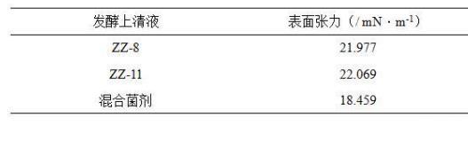 表面張力是洗油劑對原油洗脫能力的重要指標,數值越低、洗脫能力越強。測試結果顯示解淀粉芽孢桿菌(Bacillus amyloliquefaciens)ZZ-11和膠凍樣芽孢桿菌(Bacillus mucilaginosus)ZZ-8發酵上清液均能降低表面張力,混合菌劑發酵上清液的表面張力值更低。