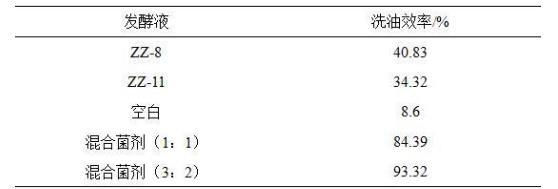 各組洗油效率測試結果如表3所示,解淀粉芽孢桿菌(Bacillusamyloliquefaciens)ZZ-11和膠凍樣芽孢桿菌(Bacillus mucilaginosus)ZZ-8發酵液均具有優秀的洗油效率,本發明混合菌劑的洗油效率更為優異,分別達到84.39%和93.32。