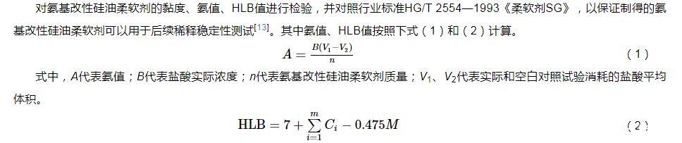 對氨基改性硅油柔軟劑的黏度、氨值、HLB值進行檢驗,并對照行業標準HG/T 2554—1993《柔軟劑SG》,以保證制得的氨基改性硅油柔軟劑可以用于后續稀釋穩定性測試。其中氨值、HLB值按照下式(1)和(2)計算。