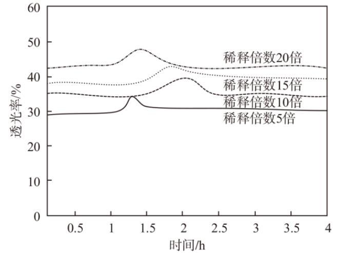 3)氨基改性硅油柔軟劑稀釋倍數與透光率之間呈正比,氨基改性硅油柔軟劑的透光率前期存在小幅度的提高和下降過程,但基本維持在一定水平上,表明透光率穩定。