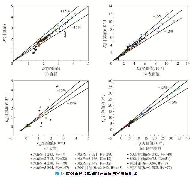 圖13液滴直徑和能量的計(jì)算值與實(shí)驗(yàn)值對比