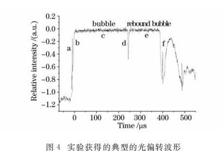 圖3給出了探測光經過脈動空泡的示意圖,圖中空泡脈動特性曲線是基于空泡半徑隨時間變化的數值模擬得到的。圖4即為由探測裝置圖2(a)獲得的對應的典型光偏轉信號波形圖,它包含了激光作用于水中靶材時的三種物理現象和過程,即激光等離子體沖擊波、等離子體空泡及其反彈現象、空泡潰滅沖擊波。圖中峰a為激光等離子體沖擊波;c為等離子體空泡信號;e為空泡反彈信號;f為空泡收縮到最小泡體積時輻射的沖擊波信號;b為空泡膨脹壁;d為空泡收縮壁。