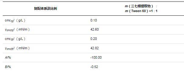 由前文實驗結果可知,三七根提取物與Tween 60的cmc均為0.1 g/L。根據2.3.2中方法,確定了三七根提取物與Tween 60復配質量比為1∶1。在25℃下,復配體系理論值和表觀值如表3所示。三七根提取物與Tween 60的復配體系形成膠束的能力減效100%,降低溶液表面張力的能力減效0.51%。結果表明,三七根提取物與Tween 60按1∶1質量比復配后,并不能對體系產生明顯的協同增效作用,這可能與三七根提取物和Tween 60的含量、結構有關。