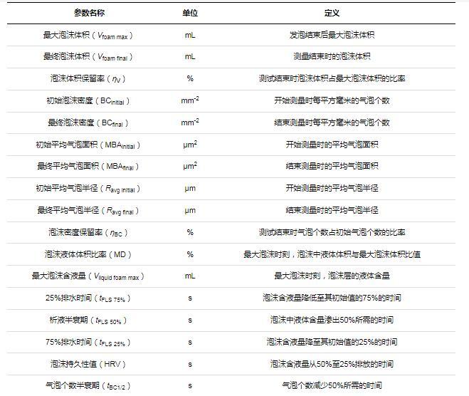 通過DFA100動態泡沫分析儀產生泡沫并檢測其泡沫性能。裝樣容器由一個玻璃圓筒組成,圓筒底部的固定攪拌槳可設定攪拌條件。將50 mL的表面活性劑待測液加入上述玻璃圓筒中,設定好測試程序,攪拌速度4 000 r/min,攪拌時間120 s,泡沫產生后系統檢測運行10 min。每次運行后,用蒸餾水清洗玻璃圓筒和攪拌槳。所有泡沫實驗均為3次重復。通過DFA100內置軟件對泡沫體積、泡沫密度、泡沫穩定性等進行分析,主要測試參數及其定義如表1所示。