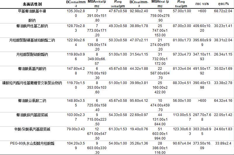 本研究除了測試表面活性劑溶液的表面張力、泡沫形態(tài)、泡沫密度保留率(ηBC)和泡沫體積保留率(ηV)外,還測試了最大泡沫含液量(Vliquid foam max)、析液半衰期(tFLS 50%)、氣泡個數(shù)半衰期(tBC1/2)、泡沫液體體積比率(MD)等指標(biāo),結(jié)果如表4和表5所示。