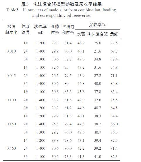 隨著水油黏度比的增大,3種泡沫復(fù)合體系采收率增幅的差異逐漸減小,水油黏度比界限為0.150:①當(dāng)水油黏度比小于該界限,分別為0.010,0.045和0.100時,1#超低界面張力泡沫復(fù)合體系驅(qū)油采收率增幅分別為25.6%,31.6%和37.8%;2#乳化泡沫復(fù)合體系驅(qū)油采收率增幅分別為21.6%,27.2%和32.6%,較1#采收率增幅低,1#超低界面張力泡沫復(fù)合體系驅(qū)油效果強(qiáng)于2#乳化泡沫復(fù)合體系,后者不能替代前者;3#雙效泡沫復(fù)合體系驅(qū)油采收率增幅分別為34.8%,40.0%和40.7%,較1#高9.2%,8.4%,2.9%;可見,在超低界面張力基礎(chǔ)上增強(qiáng)體系乳化性能,能夠明顯改善驅(qū)油效果。