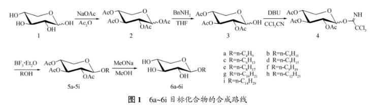 采用全乙?;哪咎?2)在四氯化錫催化下與一系列脂肪醇發生偶聯反應,對時間要嚴格控制,否則有部分轉化成α-異構體,當時間過長時,還會形成以α-糖苷為主的產物和少量2-位脫保護的糖苷副產物。參考烷基-β-D-葡萄糖苷等合成與性能研究成果,按照Scheme1所示的路線,以D-木糖(1)為原料通過乙?;?、脫1-位乙酰基、與三氯乙腈反應,得到相應的三氯乙酰亞胺酯(4)。采用易于構筑1,2-反式糖苷鍵的三氯乙酰亞胺酯法,以三氟化硼乙醚作糖苷化偶聯反應的催化劑,使得具有鄰基參與效應的三氯乙酰亞胺酯(4)與相應的脂肪醇反應及相應的脫乙酰基保護,合成一系列烷基-β-D-吡喃木糖苷,如圖1所示。本文作者對其溶解性、表面張力、乳化性能、液晶性能、熱穩定性等理化性質進行研究。