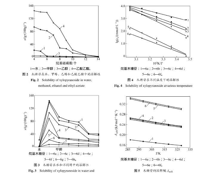 分別測出化合物6a~6f在15,25,35,45和55℃時溶解度3,再根據式(1)計算各烷基木糖苷的溶解焓(solH)。