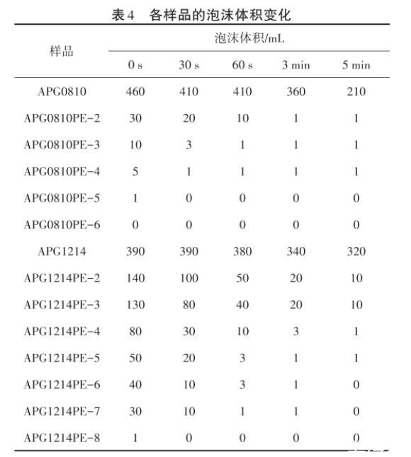 泡沫是氣體在液體中的分散體系,氣體成為氣泡被連續(xù)相的液體分隔開(kāi),氣體是分散相,液體是分散介質(zhì)。在大規(guī)模的洗滌和印染工業(yè)中,泡沫給操作帶來(lái)不便,因此新型的低泡表面活性劑越來(lái)越受關(guān)注。由表4可以看出,PO基團(tuán)引入APG中明顯地降低了泡沫的形成和穩(wěn)定性,而且在相同PO加合數(shù)下,APG0810變化更明顯,因此制備的系列樣品屬于低泡表面活性劑。