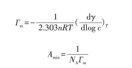 其中:T表示絕對(duì)溫度,通常取298 K;R表示氣體常數(shù),通常取8.314 J/(mol·K);NA表示阿伏加德羅常數(shù),通常取6.022×1023;n也表示常數(shù),對(duì)于離子表面活性劑n取2,對(duì)于非離子表面活性劑n取1;dγ/dlogc是指在恒溫情況下,表面張力γ隨表面活性劑濃度對(duì)數(shù)logc變化的變化率。