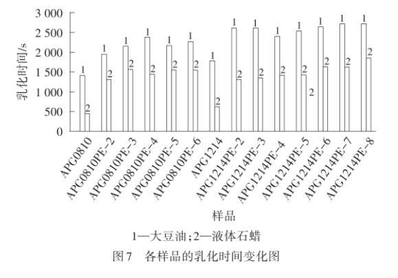 由圖7可以看出,采用乳液破乳時(shí)間表征表面活性劑的油水界面性質(zhì),APG1214和APG1214PE-m乳化大豆油以及液體石蠟的能力勝于APG0810以及APG0810PE-n,而且隨著PO加合數(shù)的增加而提高。這是由于PO基團(tuán)和烷基鏈增長(zhǎng)提供了疏水性,增強(qiáng)了乳化劑分子的乳化能力,延長(zhǎng)了破乳時(shí)間。此外,所有表面活性劑乳化大豆油的能力均明顯強(qiáng)于乳化液體石蠟,表明PO基團(tuán)可能具有類似極性作用,可以增強(qiáng)樣品與極性分子之間的協(xié)同作用,因此乳化性能更好。
