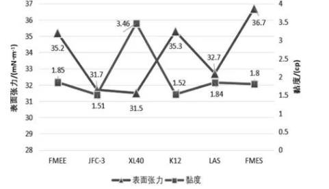 查閱大量文獻(xiàn)發(fā)現(xiàn),大多數(shù)表面活性劑溶液在質(zhì)量分?jǐn)?shù)達(dá)到5%時(shí),其表面張力變化程度保持在穩(wěn)定的數(shù)值。因此本文對(duì)表面活性劑溶液按質(zhì)量分?jǐn)?shù)為5%進(jìn)行實(shí)驗(yàn)研究,實(shí)驗(yàn)結(jié)果如圖2所示。