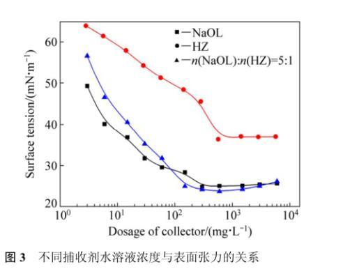 表面張力是影響浮選過程中氣泡的穩(wěn)定性,以及氣泡形成難易程度的主要參考數(shù)據(jù),臨界膠團(tuán)濃度(簡(jiǎn)稱CMC)是反映表面活性劑降低水溶液表面張力的效率。組合用藥的浮選效果優(yōu)于單一用藥,這可能與其在水溶液中的表面張力有一定的關(guān)系。圖3所示為最佳pH條件下(pH=9.0)組合捕收劑與兩種單一捕收劑的水溶液濃度與表面張力的關(guān)系。NaOL在水中微量的添加顯著地降低了水的表面張力,而隨著NaOL濃度的增加,溶液的表面張力逐漸下降,在濃度為302 mg/L時(shí)溶液的表面張力達(dá)到最低,為22.7~24.8 mN/m。此后NaOL濃度的增加并不能顯著地降低水的表面張力,所以可以確定NaOL的CMC值約為302 mg/L,與文獻(xiàn)中報(bào)道的1.03×10?3mol/L(308 mg/L)接近。而HZ的CMC值568 mg/L,表面張力36.37 mN/L。作為一種表面活性劑,其表面活性明顯不如NaOL,在較高濃度下,HZ才能形成膠團(tuán)。浮選HZ用量為200 mg/L,低于其CMC值,在此濃度下,膠團(tuán)未形成,表面張力較高,起泡性不佳,在單礦物浮選試驗(yàn)中表現(xiàn)出了泡沫量小的特點(diǎn)。組合捕收劑水溶液的表面張力測(cè)試結(jié)果表明,CMC值約為150 mg/L,CMC值下水溶液表面張力為24.88 mN/m。可見HZ的添加能降低NaOL的CMC值,這可能是NaOL作為一種陰離子型表面活性劑,親水“離子頭”之間的靜電作用較強(qiáng),非離子表面活性劑的“插入”到親水“離子頭”之間,同時(shí)亞氨基也存在一定程度的解離,使得離子之間的靜電斥力減小。