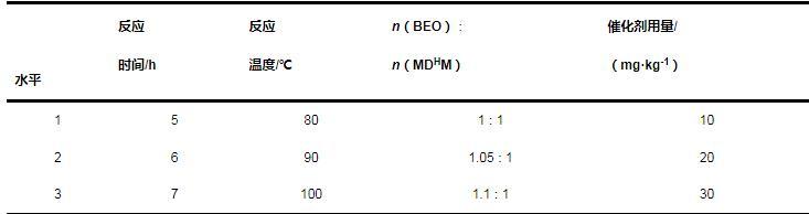 (1)以三氯化釕為催化劑,BEO和MDHM為原料,成功合成了目標(biāo)產(chǎn)物BEOTSS;采用正交試驗(yàn)優(yōu)化了催化反應(yīng)條件:催化劑用量30 mg/kg,n(BEO)∶n(MDHM)為1.05∶1,反應(yīng)時(shí)間6.0 h,反應(yīng)溫度100℃,在此工藝條件下MDHM轉(zhuǎn)化率可達(dá)99%。