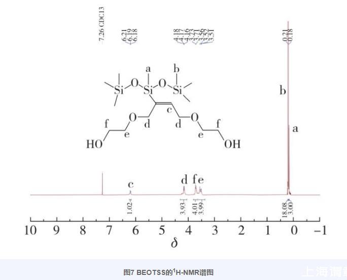 圖7為BEOTSS的1H-NMR譜圖。根據(jù)譜圖中的化學(xué)位移及積分?jǐn)?shù)據(jù)確定化合物中各基團(tuán)的氫歸屬,得到以下結(jié)果:1H-NMR(400 MHz,CDCl3),δ=6.24~6.16(m,—C=CH—,1H),4.17(m,—CH 2CCHCH 2—,4H),3.72(d,J=5.6 Hz,—CH 2—OH,4H),3.54(t,J=14.6 Hz,—O—CH 2—,4H),0.21(s,—Si(CH 3)3,18H),0.18(s,—SiCH 3,3H)。由于使用氘代氯仿作為溶劑,產(chǎn)物中的2個(gè)—OH為活潑氫,在譜圖中沒(méi)有出峰,同時(shí)結(jié)合紅外譜圖分析,進(jìn)一步證明本研究成功合成了目標(biāo)化合物BEOTSS。