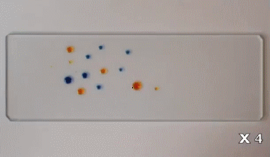 這個(gè)難度比較高,不過(guò)現(xiàn)象非常有意思。在這里使用的是含有丙二醇和水的液體食品色素,這些液滴經(jīng)過(guò)不同程度的稀釋。在非常潔凈的玻璃片上,它們因?yàn)檎舭l(fā)而產(chǎn)生表面張力的變化,從而出現(xiàn)彼此“追逐”的現(xiàn)象。詳情:
