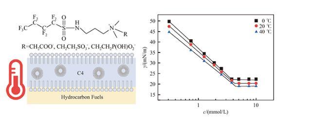然而不同溫度對表面活性劑的性能可能有一定程度的影響。尤其是機(jī)場消防領(lǐng)域,由于我國機(jī)場分布較廣,消防車滅火需要就近取水,各機(jī)場在冬季和夏季的消防用水水源溫度差異較大(一般在0~40℃)。在低溫下氟碳表面活性劑的性能可能會受到影響,進(jìn)而影響AFFF的滅火性能。我國國標(biāo)中也僅對泡沫在室溫下的性能指標(biāo)有所要求,并未嚴(yán)格考慮溫度的影響。因此,將溫度作為影響因素進(jìn)行研究,能夠指導(dǎo)表面活性劑的有效應(yīng)用。本文在溫度為0~40℃的范圍下,研究三種接枝不同親水基團(tuán)的基于短碳氟鏈的甜菜堿型兩性氟表面活性劑的一系列理化性質(zhì),為此類表面活性劑在不同溫度環(huán)境下的應(yīng)用提供理論依據(jù)。