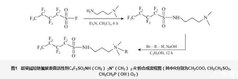 圖1甜菜堿短鏈氟碳表面活性劑C4F9SO2NH(CH2)3N+(CH3)2-R-的合成流程圖(其中R分別為CH2COO,CH2CH2SO3,CH2CH2P(OH)O2)