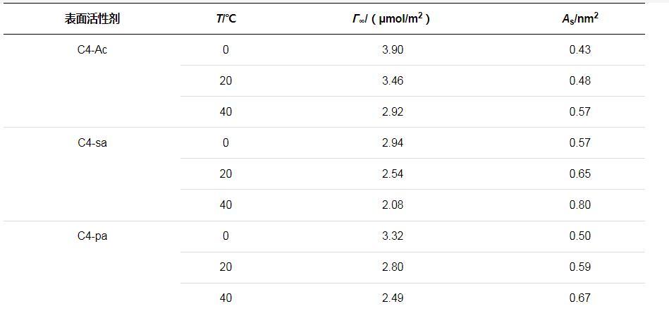 通常較高的Γ∞和較低的AS值表明表面活性劑分子密集地排列在空氣與水的界面上,由上述公式計算得到三種表面活性劑的Γ∞和較低的AS值如表2所示。對比參數(shù)可知,同種表面活性劑的Γ∞均隨溫度的升高而減小,AS有所增大,吸附表面的分子排布較為松散。這是由于溫度較高的情況下表面活性劑分子熱運動加劇,更易從吸附界面上脫離,并且因無規(guī)則運動導(dǎo)致吸附分子所占面積增大了。溫度升高導(dǎo)致溶解度的增加,因而表面的Γ∞會有所減小。由于Γ∞還受到表面張力隨濃度變化曲線斜率的影響,因此所得趨勢是綜合影響的結(jié)果。此外,由表中還可以看出,C4-sa分子的Γ∞最小,AS最大,在溶液表面的排列更加松散。這可能是由于親水端磺酸基團之間強靜電排斥力,并且空間位阻較大。