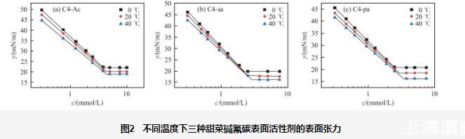 圖2不同溫度下三種甜菜堿氟碳表面活性劑的表面張力