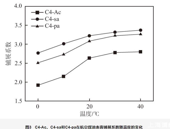 圖3 C4-Ac、C4-sa和C4-pa在航空煤油表面鋪展系數(shù)隨溫度的變化