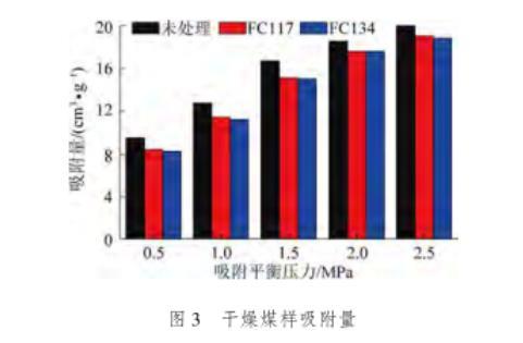 由圖3可知,隨著甲烷吸附平衡壓力的增加,氣潤濕反轉(zhuǎn)劑處理前后煤樣的吸附量均逐漸增加,且增加量均呈現(xiàn)逐漸減小趨勢。經(jīng)過氣潤濕反轉(zhuǎn)劑FC117和FC134處理后的煤樣吸附量始終小于未處理的煤樣。其中,產(chǎn)生該現(xiàn)象的原因主要為:一方面,氣潤濕反轉(zhuǎn)劑分子自身占有一定的體積,隨水溶液一同進(jìn)入煤體內(nèi)部。在干燥過程中,水分通過蒸發(fā)作用排出煤體,而氣潤濕反轉(zhuǎn)劑分子則滯留在煤體內(nèi)部,進(jìn)而減小甲烷分子的吸附空間;另一方面,氣潤濕反轉(zhuǎn)劑具有低表面張力的特性,在吸附在煤體內(nèi)部孔隙裂隙的表面,降低其表面自由能,減小對甲烷分子的吸附能力,進(jìn)而使得吸附量下降。