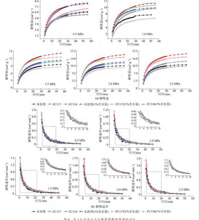 通過對干燥煤樣解吸量和解吸速率的分析,經過氣潤濕反轉劑FC117和FC134處理后的煤樣解吸量和解吸速率均有所提升。定量地分析了氣潤濕反轉劑通過物理吸附的方式吸附在煤體表面,降低煤體表面自由能,增加煤樣解吸量,為氣潤濕反轉劑提高瓦斯抽采效果提供理論依據。