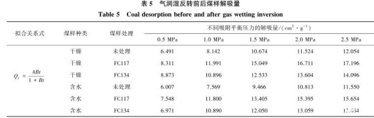 4)對經過FC117和FC134處理后的干燥/含水煤樣進行解吸量和解吸速率的測定,兩種表面活性劑處理后煤樣的解吸效果均有顯著的效果。在氣潤濕反轉劑處理后的煤樣吸附量小于未處理的,而解吸量和解吸速率大于未處理的,則表明氣潤濕反轉劑處理后的煤樣可以消除水鎖效應,增加解吸率,提高解吸效果。