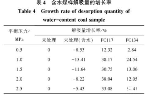 由圖6a可知,隨著甲烷吸附平衡壓力的增加,3種處理方式的含水煤樣解吸量均逐漸增加,且增加量均呈現逐漸減小趨勢。經過氣潤濕反轉劑FC117和FC134處理后的含水煤樣解吸量始終大于未處理的煤樣,與干燥煤樣解吸量的規律基本一致。同時,在3種不同處理方式條件下,干燥煤樣的解吸量均大于含水條件下的解吸量,其結果表明在含水煤樣解吸過程中存在一定程度的水鎖效應。