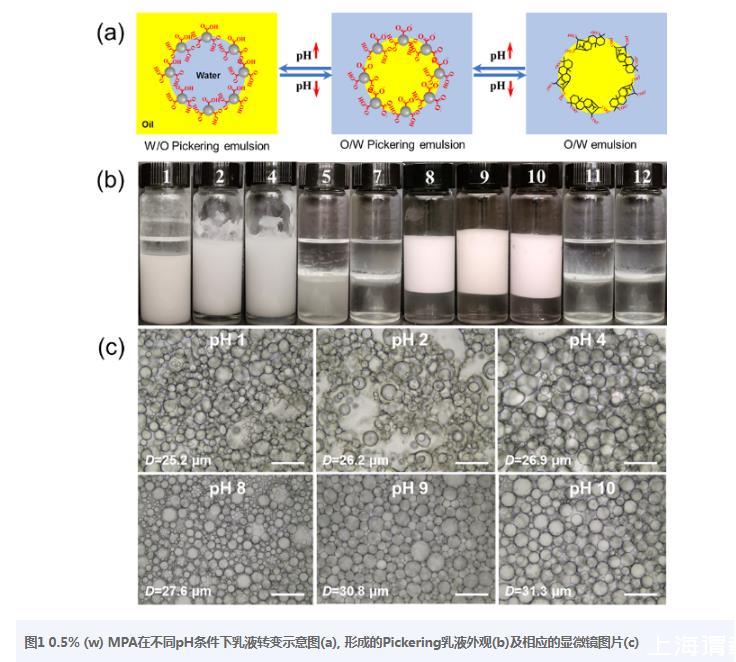 圖10.5%(w)MPA在不同pH條件下乳液轉變示意圖(a),形成的Pickering乳液外觀(b)及相應的顯微鏡圖片(c)