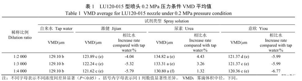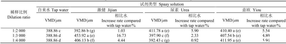 注:數(shù)字后不同字母表示同1行不同溶液間差異顯著(<0.05),括號內字母表示同1列數(shù)值顯著性差異(<0.05)。VMD:霧滴體積中徑。下同。