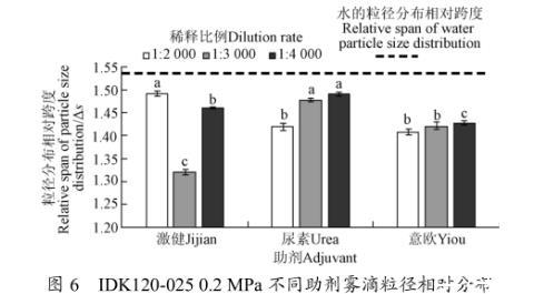 此試驗條件下自來水的粒徑相對分布跨度為1.544。3種助劑溶液霧滴粒徑相對分布跨度Δ受溶液配比因素影響程度不同。激健溶液1:3 000配比條件下對霧滴粒徑相對分布跨度影響最為顯著,為1.320,與水相比減小14.50%,明顯優(yōu)于該條件下其他各組數(shù)據(jù)。與尿素相比,意歐助劑在各濃度比例下對霧滴粒徑相對分布影響保持在降低8%左右,改善效果更優(yōu),且受濃度變化影響小。