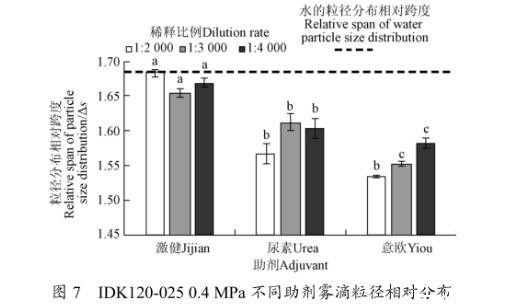 3)IDK120-025型噴頭,0.4 MPa壓力下。激健在配比1:3 000條件下,相比于自來水霧滴體積中徑增大20.43%,霧滴粒徑相對(duì)分布跨度減小1.74%。尿素與意歐溶液在配比1:2 000條件下,相比于自來水霧滴體積中徑分別增大16.92%、11.10%,霧滴粒徑相對(duì)分布跨度分別減小6.92%、8.86%,在增大霧滴體積中徑的同時(shí)有效改善霧滴分布質(zhì)量,增大霧滴飄移可控性。
