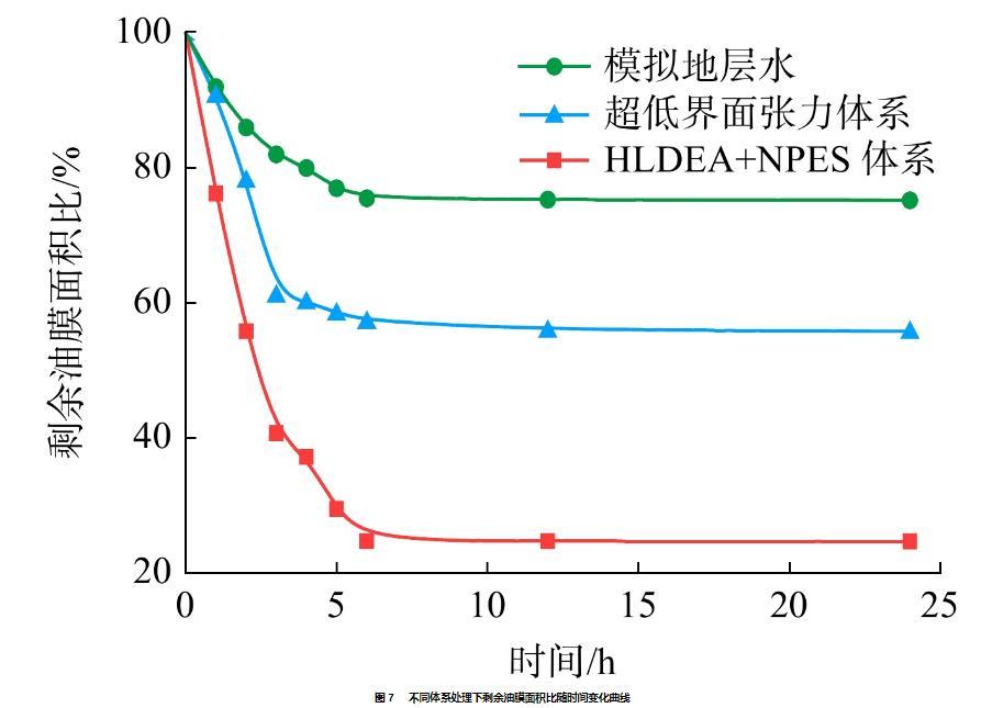 2)HLDEA+NPES體系可將油水界面張力降低至3.8×10?3 mN/m,水下油滴接觸角由41.34°增加至162.53°,使得24 h內油膜剝離率高達75.3%。
