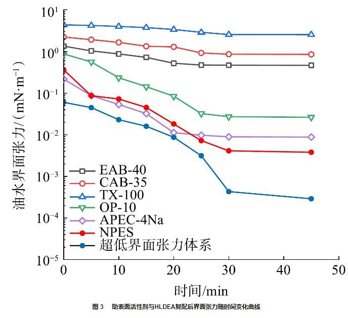 圖3助表面活性劑與HLDEA復配后界面張力隨時間變化曲線