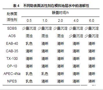 表4不同助表面活性劑在模擬地層水中的溶解性