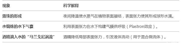 水的表面張力是由水分子間氫鍵作用產生的獨特性質,它在自然界和科學技術中表現出多種有趣的現象。以下是水表面張力的主要現象及其解釋: