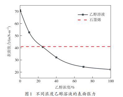 水和乙醇的表面張力分別為70.95 mN·m-1和22.17 mN·m-1,我們采用一定體積比的乙醇和水調(diào)配出與微晶石墨表面能接近的乙醇水溶液,并以此為溶劑球磨微晶石墨,研究溶劑的表面張力對球磨后微晶石墨粒徑的影響。從圖1可知,25%乙醇溶液的表面能為40.69 mN·m-1,與石墨烯的表面能(40.80 mN·m-1)相近,從圖2可知,其對應(yīng)的微晶石墨中位粒徑最小。當(dāng)溶劑的表面能與微晶石墨表面能相近時,微晶石墨能更好地分散在溶劑中,從而提高球磨效率。所以在本工作中,選擇25%的乙醇水溶液作為球磨溶劑。