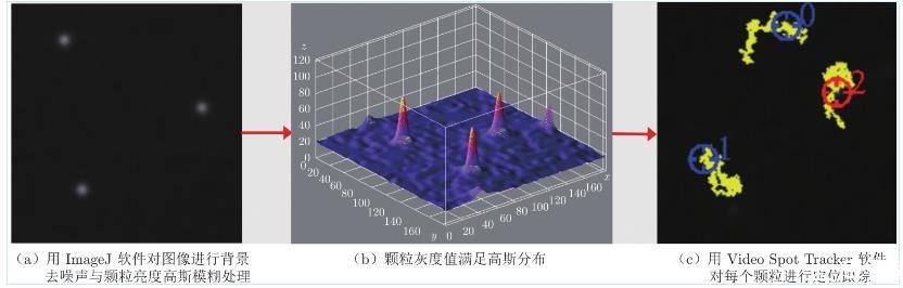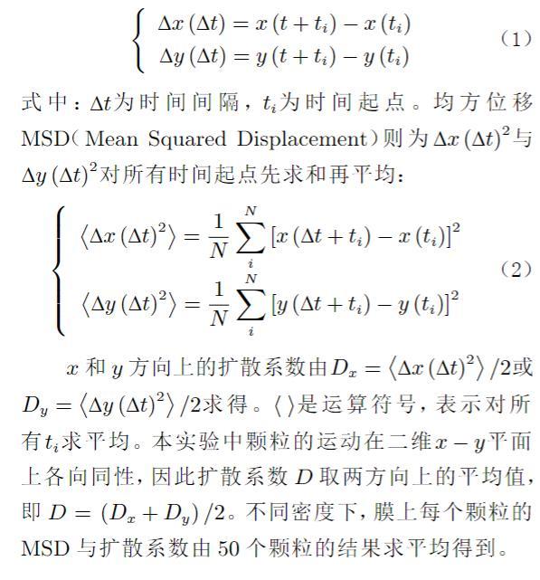 實驗采用Olympus顯微鏡(配備60倍物鏡)觀察顆粒在膜上的布朗運動,同時利用電子增益高速攝像機(Andor 897 EMCCD)進行拍攝。每個視頻拍攝時間為200 s,幀頻為0.05 s,曝光時間5 ms,圖像尺寸為300像素×300像素,分辨率為0.26μm/m。采集原始圖像中的顆粒灰度值不符合標準高斯分布,因此使用圖像處理軟件ImageJ對圖像進行背景去噪聲(Background Subtraction)和高斯模糊(Gauss-ian Blur)處理(圖3(a)),使顆粒灰度值達到標準高斯分布(圖3(b))。之后用Video Spot Tracker軟件定位每個顆粒的灰度峰值(圖3(c)),即顆粒質(zhì)心,定位誤差僅為0.5像素,進而對顆粒二維運動軌跡(平面)進行實時跟蹤。軟件自動將顆粒在每一時刻的像素位置坐標存入計算機中,使用MATLAB計算顆粒在不同時間間隔Δt內(nèi)沿和方向的位移,計算公式如下: