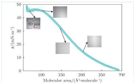 圖2為膜表面壓強隨膜密度的變化曲線,(以DPPC磷脂分子所占平均面積作為衡量膜密度的物理量)。在顯微鏡下觀察了膜在不同密度下的形貌(圖2中4張照片)。膜被壓縮到100?2/molecule之前,處于液態(tài)擴張(Liquid Expanded,LE)相,磷脂分子排列較松散,膜表面結構均勻。當膜被壓縮到60~100?2/molecule時,膜上開始出現(xiàn)直徑為幾微米的磷脂凝聚(Tilted Condensed,TC)相(照片中斑點),TC區(qū)域內(nèi)磷脂分子的排列比LE區(qū)域更緊密。熒光劑Texas red DHPE傾向于分布在LE區(qū)域,因此LE區(qū)域顯示為淺色,TC區(qū)域顯示為深色。膜繼續(xù)被壓縮,在LE?TC共存相階段,膜表面壓強恒定在45 mM/m左右,TC區(qū)域數(shù)量和面積占比增大。當膜被進一步壓縮(<60?2/molecule),此時膜表面幾乎被TC區(qū)域占據(jù),TC區(qū)域相互擠壓,導致膜表面壓強直線上升,LE區(qū)域僅存在于TC區(qū)域之間的空隙。
