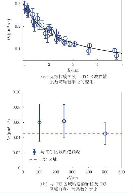 在LE–TC共存相膜上,所有顆粒均與TC區域邊緣粘連,因此難以確定顆粒的等效粒徑,本節只對其擴散系數進行討論。首先,由實驗測量了無顆粒噴灑膜上TC區域的擴散系數(圖9(a)),由HPW模型擬合: