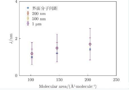 公式中,純水界面的表面張力為宏觀尺度準靜態條件下的測量值。對于被膜覆蓋的界面,膜的彎曲剛度、黏彈性可能會影響表面張力。此外,熱力學毛細波波長為單個分子尺寸約為幾納米,與亞微米顆粒在尺寸量級上更為接近,這個尺度下的表面張力大于宏觀尺度下的值,通常由熱力學毛細波振幅測得: