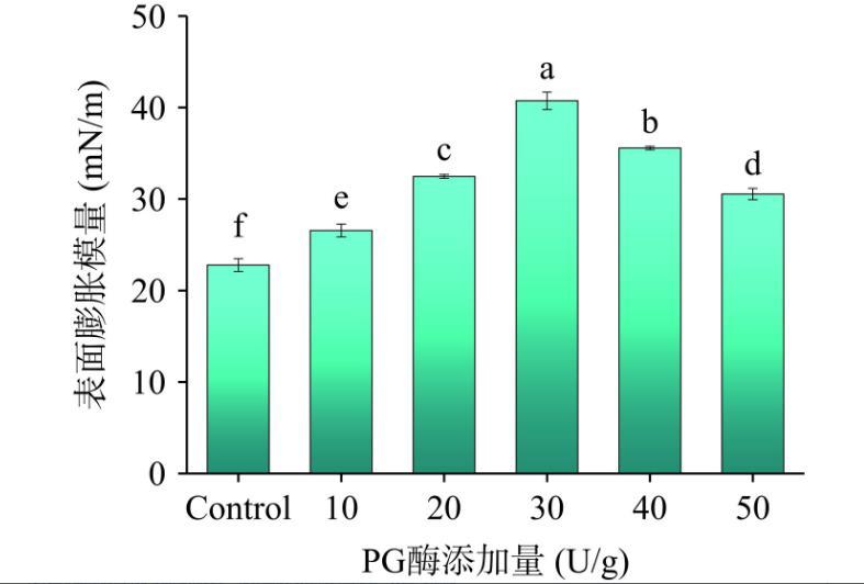 表面膨脹流變學是一個重要的表征,通過其可以確定吸附在氣-水界面的蛋白質的相互作用。如圖2所示,隨著PG添加量的增大,脫酰胺玉米醇溶蛋白的表面膨脹模量呈現先增大后減小的趨勢。當加酶量達到30 U/g時蛋白質的表面膨脹模量達到了最大40.74 mN/m。這可能是因為適度的脫酰胺,增強了蛋白質分子柔性,形成了致密的三維網狀結構,疏水性基團暴露,蛋白質分子之間的相互作用加強,從而增強了蛋白質在吸附層薄膜的穩定性。當PG量繼續增加時,蛋白質網絡結構塌陷,重新形成了聚集體,疏水相互作用減弱使蛋白質界面膜的穩定性變差。