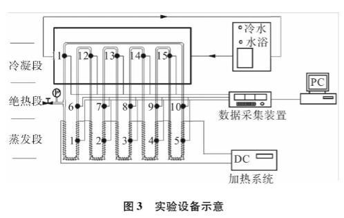 脈動熱管由外徑4 mm、內徑2 mm,經氧乙炔正火處理后銅毛細管彎曲而成。圖3示出了脈動熱管實驗設備的示意圖。用誤差傳播法分析了實驗裝置的不確定性。電壓電流精度為1%。本文中最小電壓和電流分別為17.9V和1.7A。此外,熱電偶的不確定度為0.1℃。在蒸發器和冷凝器的最小溫差為45℃時,熱阻的最大相對不確定度為4.47%。