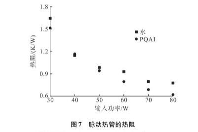 結(jié)果表明在100W的加熱功率下,PQAI脈動熱管的熱阻比純水脈動熱管降低了20.8%。綜上所述,以PQAI水溶液作為工質(zhì)并經(jīng)氧乙炔正火處理的脈動熱管表現(xiàn)出較好的傳熱性能。